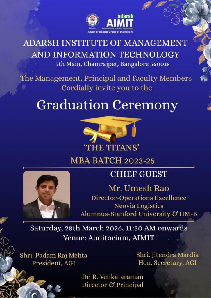 Adarsh Institute of Management and Information Technology (AIMIT) proudly announces the Graduation Ceremony for the MBA Batch 2023–25, fondly known as “The Titans.” This special occasion marks the successful academic journey of our students as they step into the professional world with confidence, knowledge, and ambition.